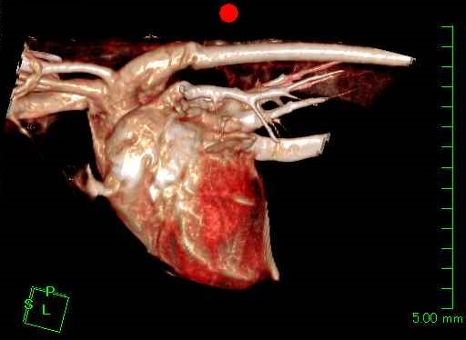 外科治療では開胸手術により動脈管を糸で結紮し血流を遮断します。当院では外科手術をよりスムーズに行う目的で術前のCT撮影で動脈管を確認することおこなっています。