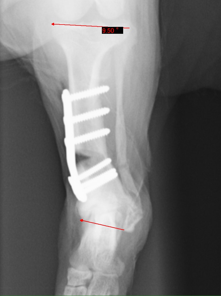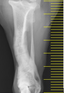 跛行を示す疾患の除外と、左脛骨のX線検査を実施し、脛骨の内反を確認することです。このX線検査から、矯正手術を行う角度を求めます。